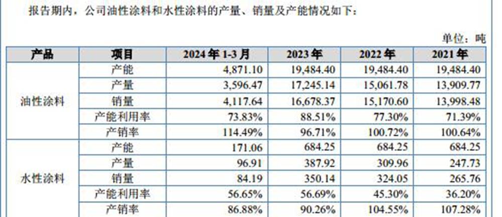 从产能与利用率数据来看,油性涂料无疑是雅图高新的 “营收主力”。截至 2024 年末,公司油性涂料产能达 1.95 万吨 / 年,是水性涂料产能(684.25 吨 / 年)的 28.5 倍。2022年至2024年,雅图高新水性涂料的产能利用率分别为45.3%、56.69%、70.39%;而油性涂料产能利用率分别是77.30%、88.51%、103.39%。