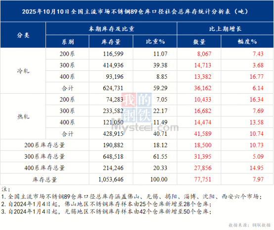 据Mysteel调研,全国主流市场不锈钢89仓库口径社会总库存105.35万吨,周环比增7.96%。国庆假期期间,钢厂正常生产而贸易加工企业及下游企业多处放假状态,导致资源在节后集中到货,社会库存出现明显回升。