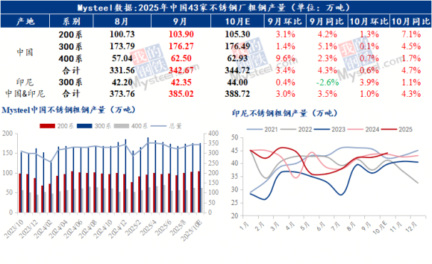 据Mysteel统计,2025年9月国内43家不锈钢厂粗钢产量342.67万吨,月环比增加11.11万吨,增幅3.35%,同比增加4.32%。10月排产344.72万吨,月环比增加0.6%,同比增加4.75%。9 月传统旺季需求环比回升(建筑业、制造业用钢需求复苏),钢厂节前补库、节后垒库,即使终端需求弱复苏,仍维持高排产以应对 “银十” 投机性需求。
